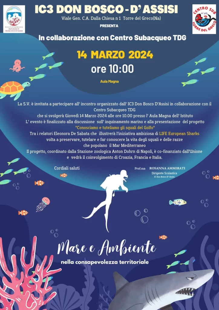 Agli incontri con gli studenti di LIFE European Sharks, organizzati il 14 e 15 marzo 2024 dal Centro Subacqueo Torre del Greco, parteciperanno il Sindaco torrese, il Presidente del Consiglio Comunale di Sorrento, l’Area Marina Protetta Punta Campanella, la Capitaneria di Porto